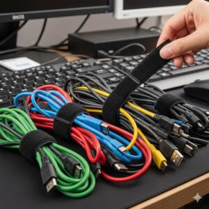 - Kabelmanagement: Het is de meest populaire toepassing, vooral in de ICT, evenementen- en installatietechniek. Het wordt gebruikt om kabels van computers, tv’s en andere apparatuur netjes te bundelen en te organiseren, zonder ze af te knellen.